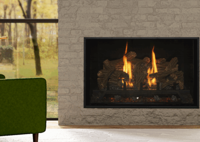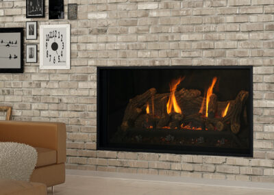 Deep firebox direct vent fireplace with a high definition traditional log set