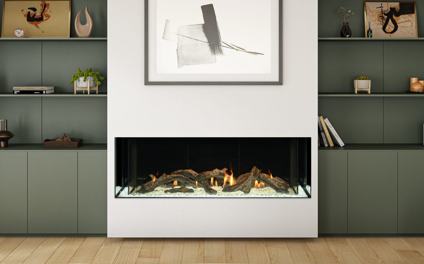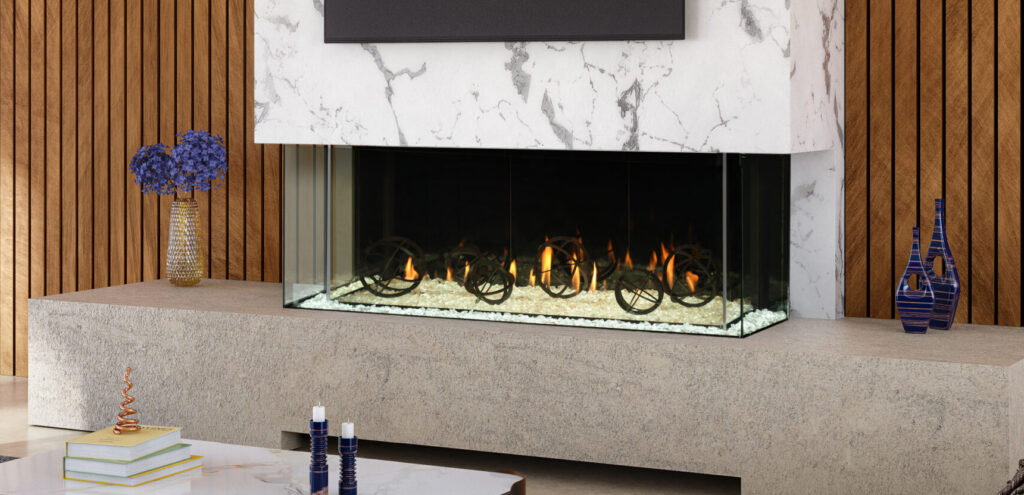The Generation – a sleek frameless design with cutting-edge features, clean lines, and a streamlined profile. These fireplaces set a new standard for modern luxury and are destined to be the centerpiece of your home. One Model, Four Installation Options (Front facing, Corner, or 3-Sided Bay), High-definition Log Sets and Geometric Sphere Media Options,
