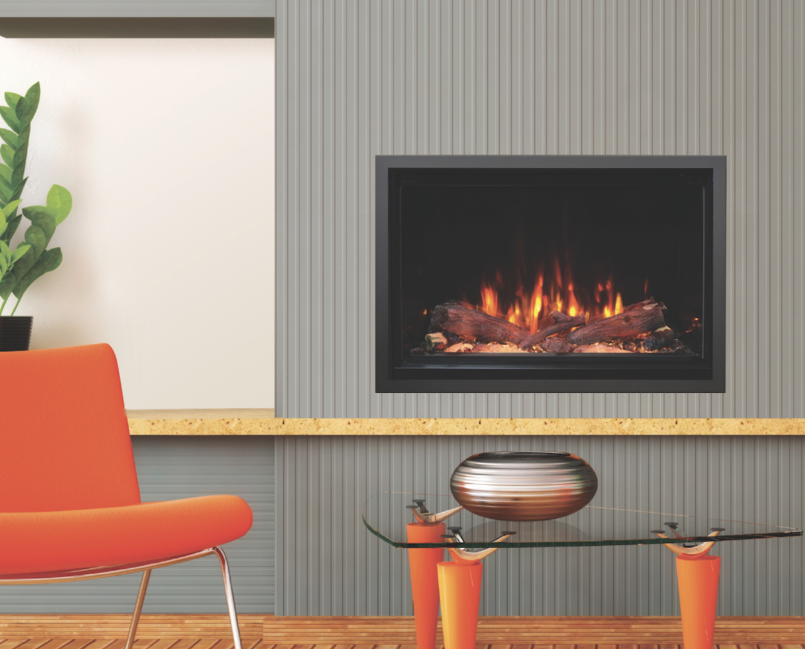 Osseo eSeries Insert Electric Fireplace comes in 2 sizes: 29, & 34. Traditional or birch log set, 7 downlight accent options, 13 glowing ember options and can use Chaska decorative screen fronts.